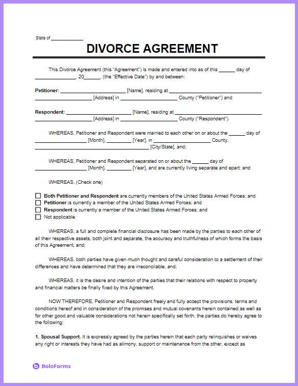 The Divorce Agreement is typically reviewed and signed by both spouses, and it may be submitted to the court for approval as part of the divorce proceedings. It is a crucial document that provides a roadmap for the post-divorce relationship between the parties and helps avoid potential disputes. It's essential for each party to seek legal counsel to ensure that their rights and interests are adequately protected before signing a Divorce Agreement.