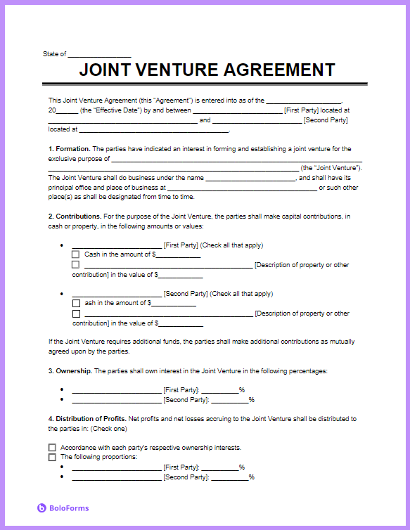 A Joint Venture Agreement is a legal document that outlines the terms and conditions governing a business collaboration between two or more parties. In a joint venture, participants combine their resources, skills, and expertise to undertake a specific project, venture, or business activity. This agreement sets forth the rights, responsibilities, and contributions of each party, as well as the terms for sharing profits, losses, and liabilities.