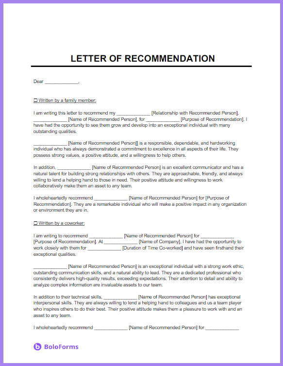 A Letter of Recommendation is a formal written document where an individual provides a positive endorsement or commendation for another person. It is typically written by someone who is in a position to evaluate the qualifications, skills, achievements, and character of the person being recommended. Letters of recommendation are commonly requested in various contexts, including job applications, college admissions, scholarship applications, and professional endorsements.