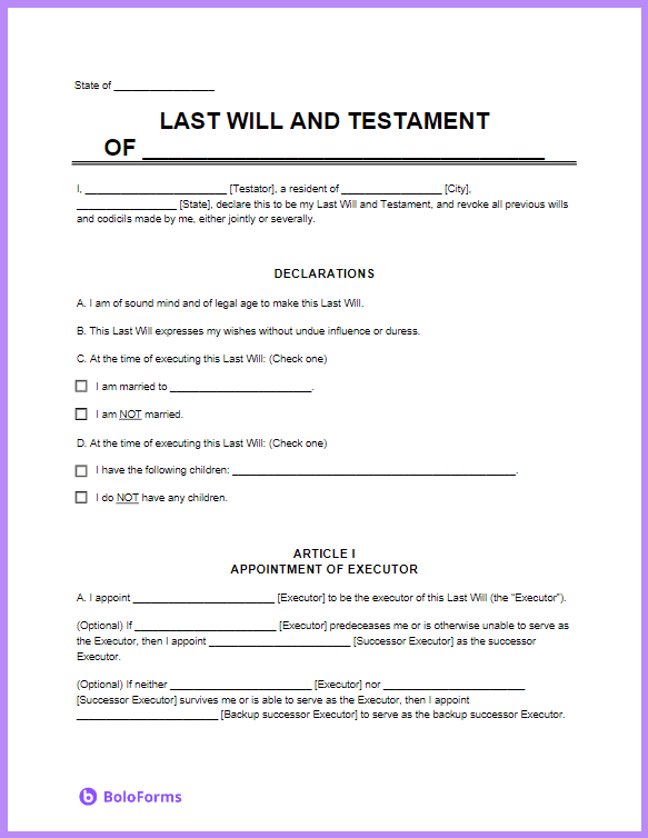 A Last Will and Testament form is a standardized document that individuals can use to create their will. It typically provides a template with fill-in-the-blank sections where individuals can input their personal information, specify how they want their assets distributed, appoint an executor, and address other important matters related to their estate.