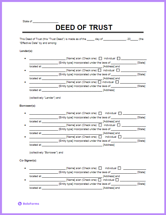 A Deed of Trust is a legal document used in real estate transactions that involves three parties: the borrower (trustor), the lender (beneficiary), and a neutral third party known as the trustee. The purpose of a Deed of Trust is to secure a loan with real property as collateral, providing a mechanism for the lender to foreclose on the property in the event of the borrower's default.