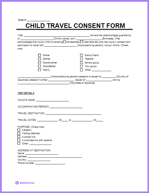 A Minor (Child) Travel Consent Form is a legal document that provides permission from a parent or legal guardian for a minor child to travel with another adult who is not their parent or legal guardian. This form is often required when a minor travels alone, with only one parent, or with someone other than their legal guardian. It is used to demonstrate that the child has the consent of their parent or guardian to travel and that the accompanying adult has permission to act in a supervisory role.