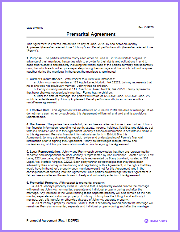 A Prenuptial Agreement, often referred to as a "prenup" or "premarital agreement," is a legally binding contract entered into by a couple before they get married or enter into a civil partnership. This agreement outlines how various financial matters, assets, debts, and other issues would be handled in the event of a divorce, separation, or death. Prenuptial Agreements are designed to provide clarity and establish the legal rights and responsibilities of each spouse in the event of the dissolution of the marriage.