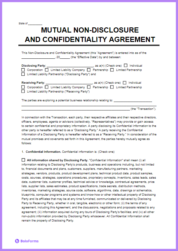A Non-Disclosure Agreement (NDA), also known as a confidentiality agreement, is a legal contract between two or more parties that outlines the confidential information they intend to share with each other and the terms under which the information will be kept confidential. NDAs are commonly used in business, legal, and professional settings to protect sensitive information, trade secrets, business plans, intellectual property, and other proprietary data from being disclosed to unauthorized parties.