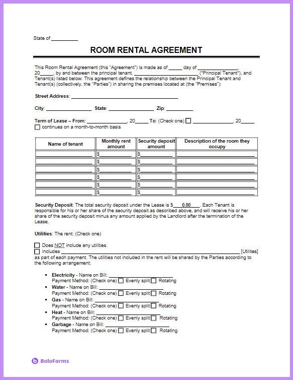 A Room Rental Agreement, also known as a Roommate Agreement or a Sublease Agreement, is a legal document that outlines the terms and conditions under which a person (the "tenant" or "roommate") rents a room within a residential property from the primary tenant or the property owner (the "landlord" or "master tenant"). This agreement is commonly used when individuals share a house, apartment, or other living space.
