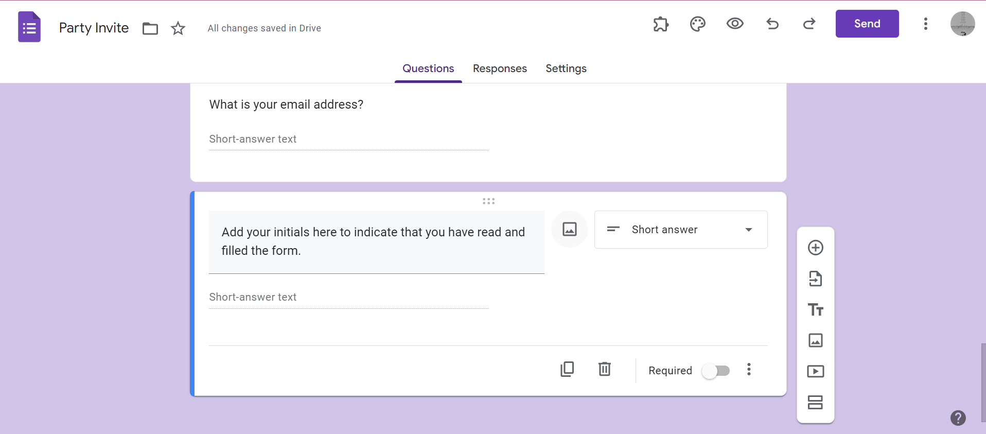 Step 3. Question Text: In the question field, type something like, "Add your initials here to indicate you've read this form and agree with it" or "By selecting 'Yes,' you indicate you agree with these terms and conditions."