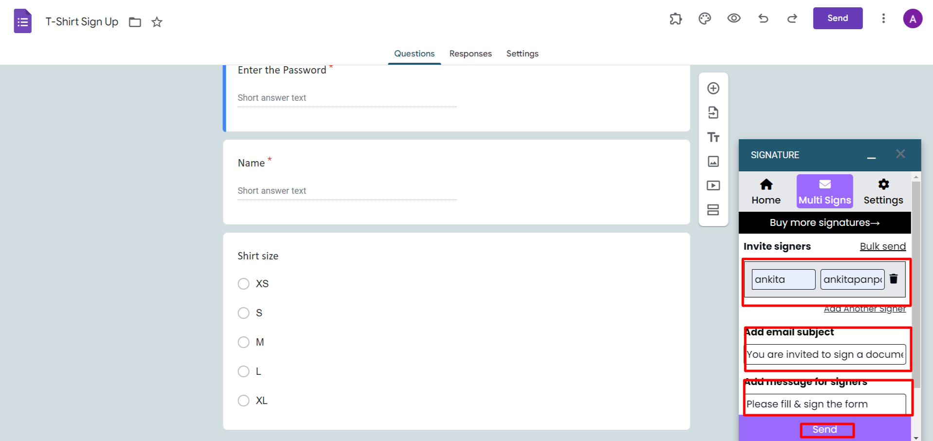 Sync Google Form with BoloForms. Next, prepare to send an electronic signature in Google Forms by clicking on "Invite signers" in the add-on interface. In the provided fields, enter the recipient's name and email address. You can also include an email subject and message for signers that will be sent along with the email.