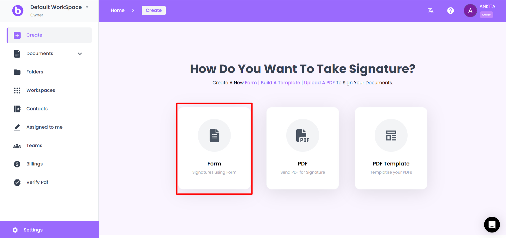 In the form creation process, you have the freedom to incorporate various fields, including a specialized Signature field designed for capturing E-Signatures.