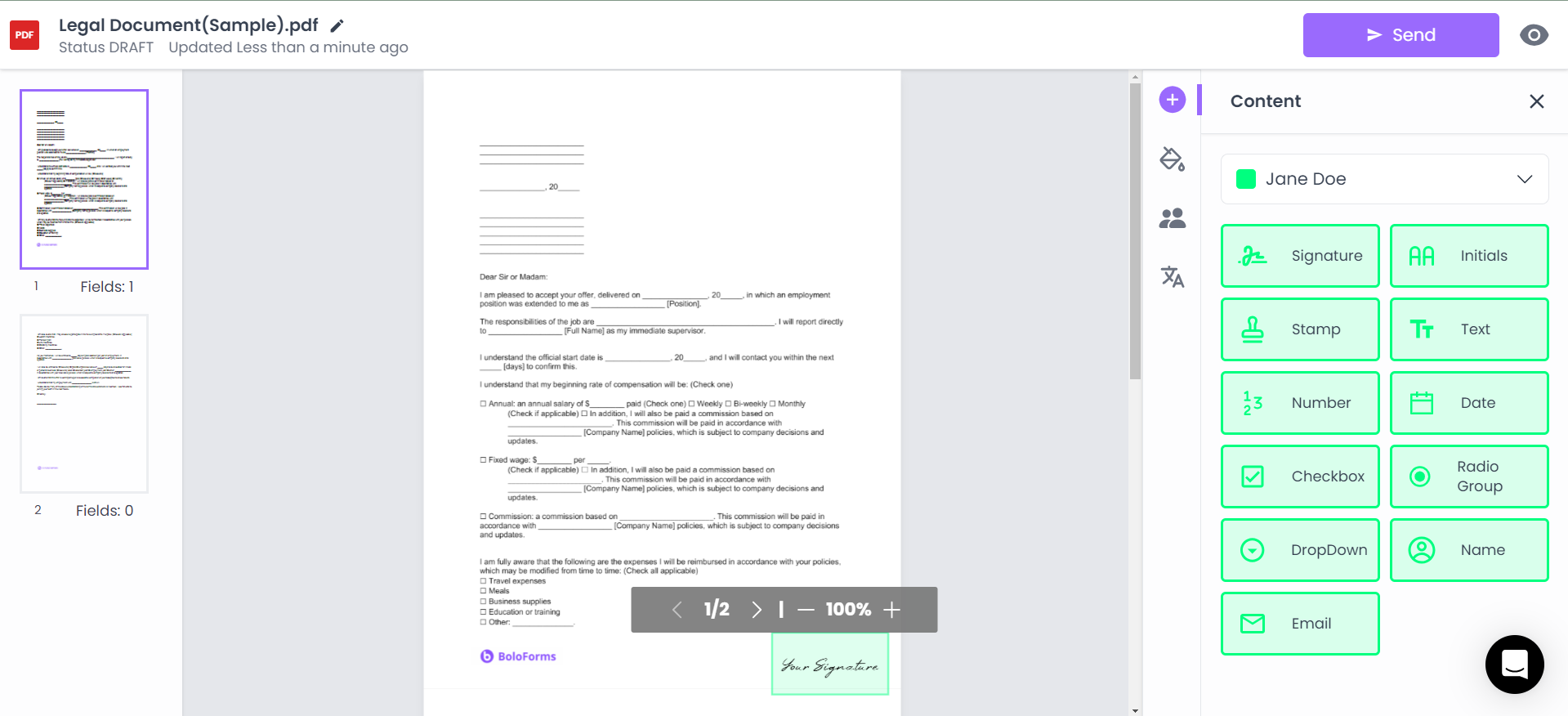 Multiple Signatures: BoloForms supports the creation of multiple signatures for users who require signatures for different purposes or roles. Users can create and save multiple signatures within their BoloForms account, allowing them to choose the appropriate signature for each document or transaction.