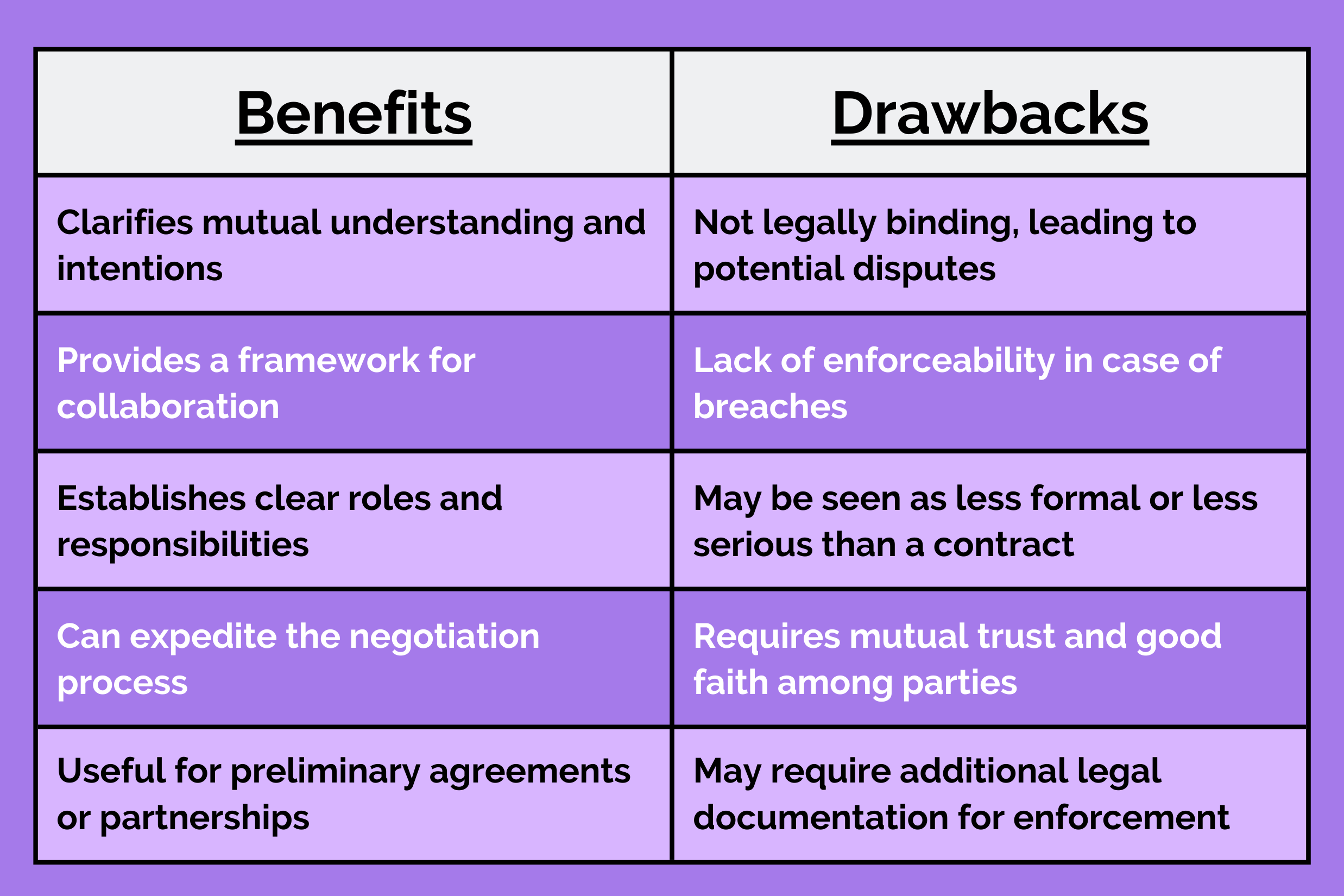 Drawbacks: Not legally enforceable, focuses on broader outlines rather than specifics, and can be susceptible to misinterpretation.