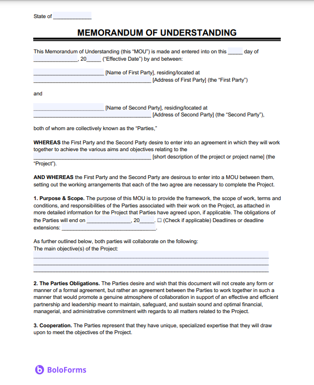A memorandum of understanding (MOU) is a document that outlines the terms and details of an agreement between two or more parties who are entering into a cooperative or collaborative relationship. While an MOU is not legally binding like a contract, it serves as a formalized understanding of the intentions and commitments of the involved parties.