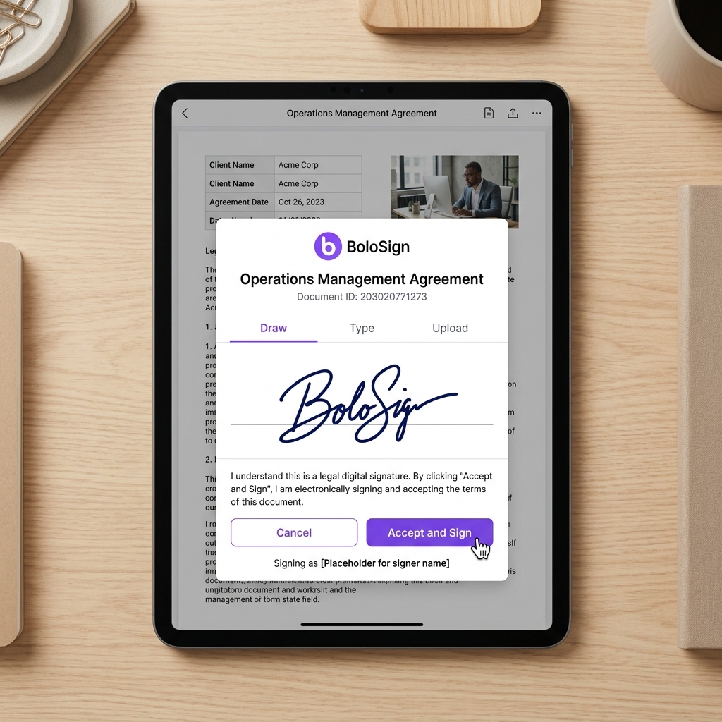 BoloSign meets all requirements for legally enforceable electronic signatures under US federal (ESIGN Act) and state (UETA) laws: intent to sign, consent to electronic business, association of signature with record, and record retention. Your operations management agreements are as legally binding as ink signatures.