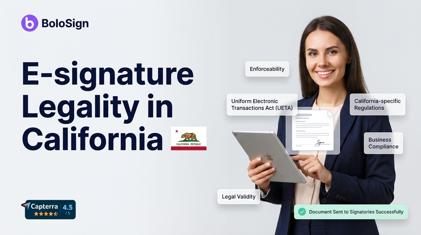 For cross-border contracts from California, ensure your e-signature platform meets both jurisdictions' requirements. BoloSign's ISO 27001 and GDPR compliance covers most international scenarios.